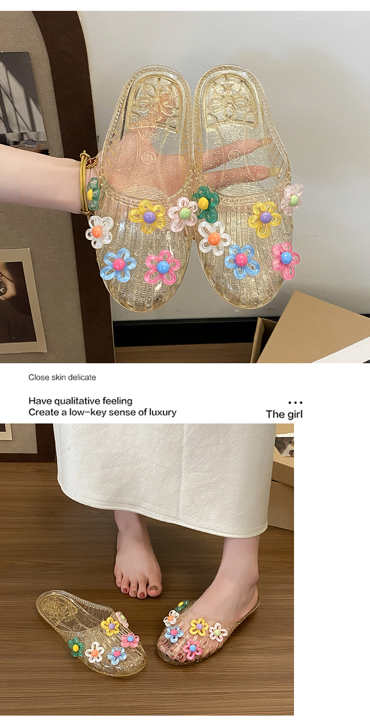 Crystal sandals for women, flat-soled, transparent half-slippers, floral jelly shoes, soft-soled slippers, closed-toe outdoor shoes