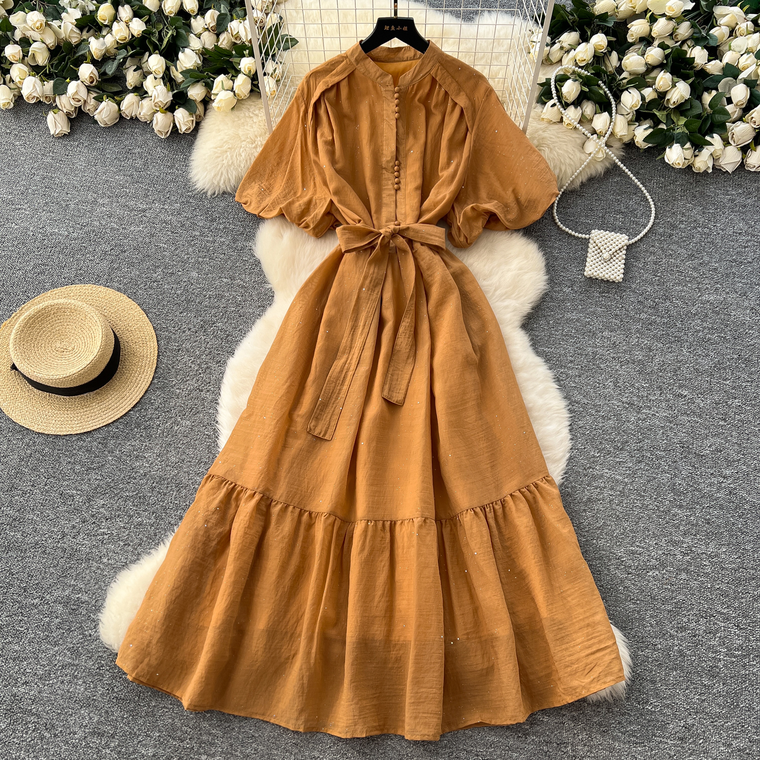 French fashion stand collar lantern sleeve tie waist dress for women slim temperament shiny ruffle long skirt