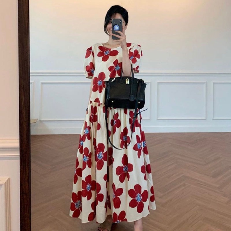 Retro French temperament dress women 2023 summer loose large size waist slimming A-line long skirt with floral patterns